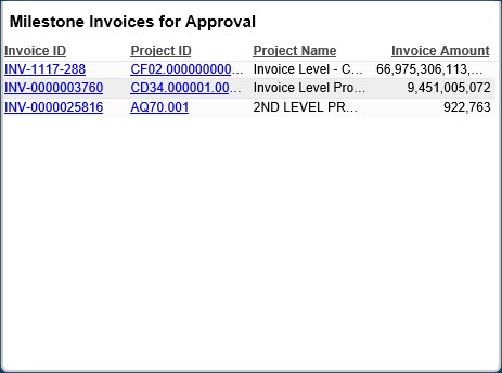 The Milestone Invoices for Approval dashpart is a numerical table that displays the milestone bills for approval, their corresponding invoice amounts, and the project associated with them. The data on this dashpart comes from Costpoint.