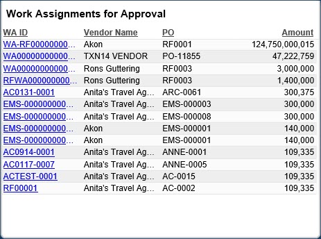 You can approve work assignments at either the work assignment level or the charge line level, depending on the type of approval required for the work assignment and your approval rights. If the approval is at the work assignment level, you will see the amount for all charge lines linked to the work assignment. If it is at the charge line level, you will see the amount applied only to the charge lines that you can approve.