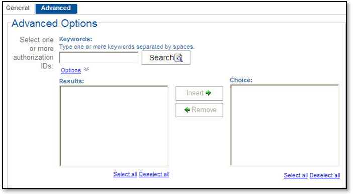 Enter a portion of one or more authorization IDs in the Keywords field and click Search to list authorizations to include on the report. You can use the steps in entering keywords in the Keywords search fields to return the results you are looking for. |