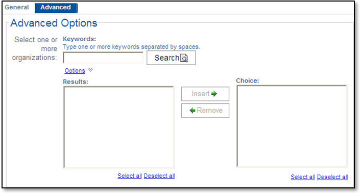 Enter a portion of one or more organization IDs in the Keywords field and click Search to list organizations to include on the report. You can use the steps in entering keywords in the Keywords fields to return the results you are looking for. |