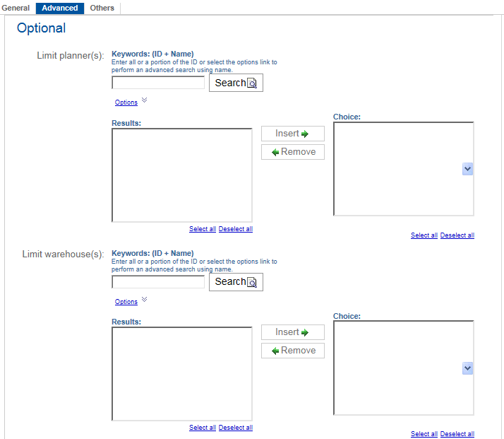 Enter a portion or the entire ID of one or more warehouses in the Keywords: (ID + Name) field to be added on the report. You can use the steps in entering keywords in the Keywords fields to return the results you are looking for. |