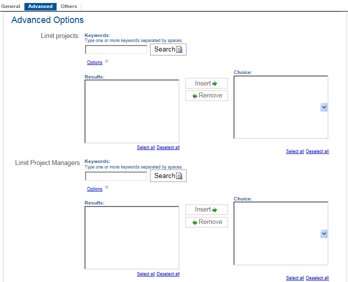 Use this option to limit the report to selected project managers. (If you make no selections, the report includes all project managers.) In Keywords, enter one or more characters for which you want to search to retrieve project managers. The list displays values as a combination of ID and name, so you can search by ID or by name. To enter more than one search string, separate them with spaces. Click Options to specify how you want the search to match your entries with the IDs or names. (If you search by name, use one of the Contains... options, rather than the Starts with... options.) Click Search to list the matching project managers in Results. Select the project managers in Results that you want to include and click Insert to move them to Choice. To select multiple project managers that are together in the list, click the first project manager in the group and then press SHIFT as you click the last one in the group. To select multiple project managers that are not listed together, press CTRL as you click each one. When you generate the report, it includes only records for the project managers in Choice. |