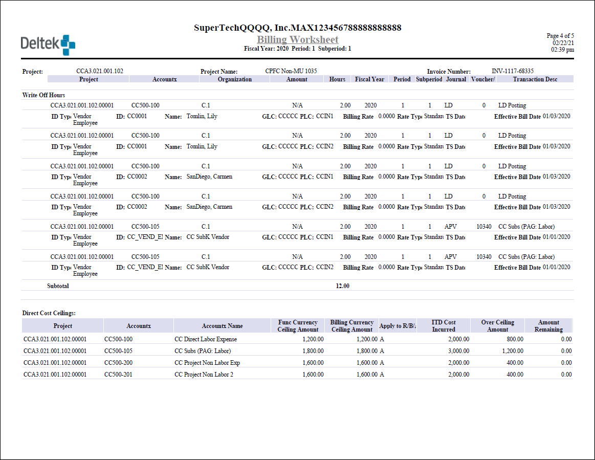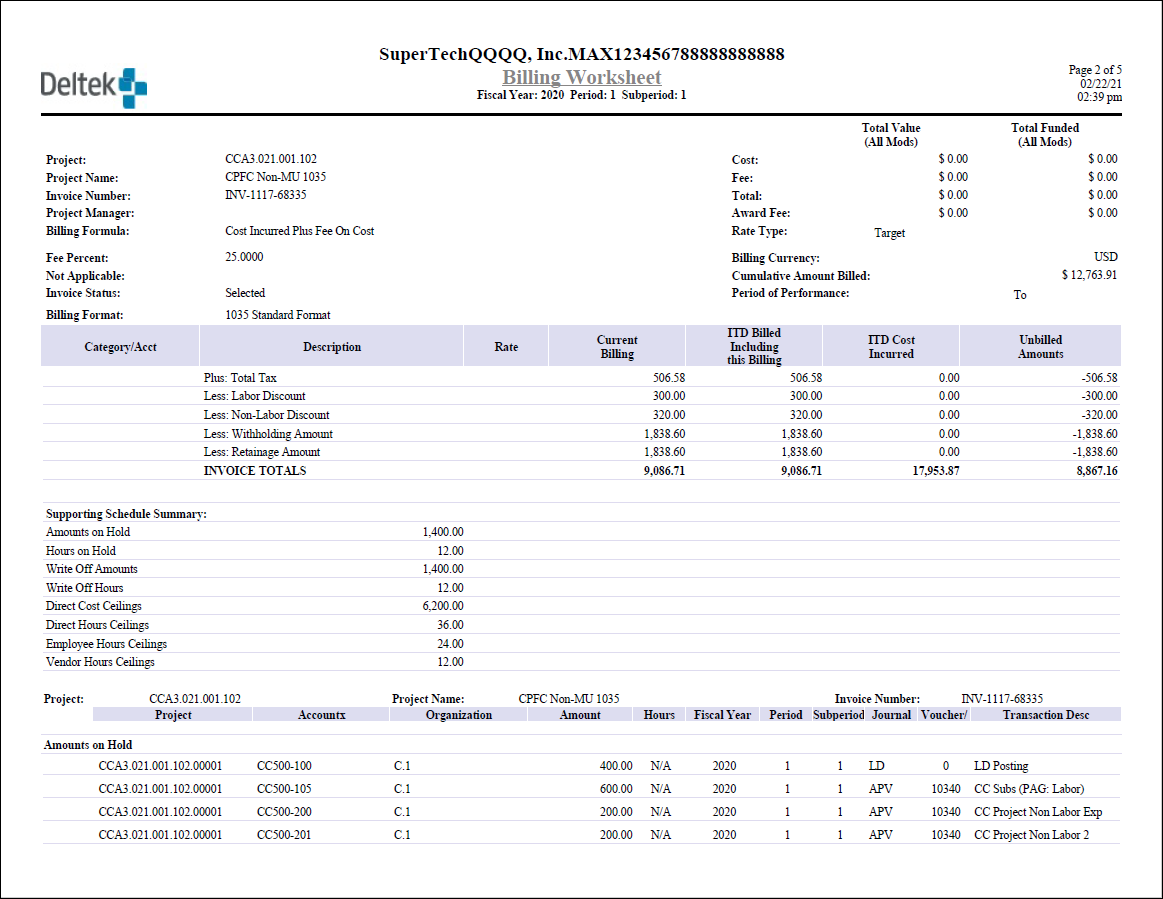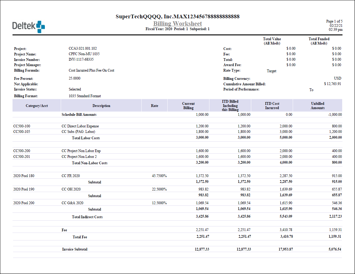 Here is an example of the billing worksheet with supporting schedule for the Cost Incurred Plus Fee On Cost (CPFC) billing formula.