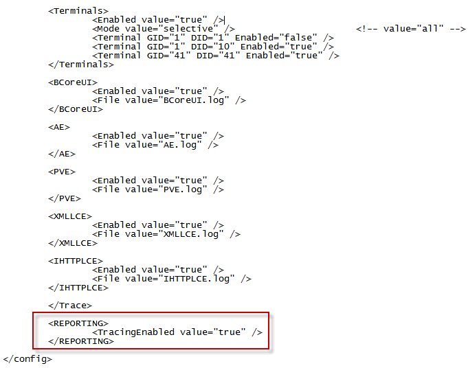 To log errors that occur in the reporting module, a REPORTING setting can be added in the config.xml file. To add the setting in the config.xml file: