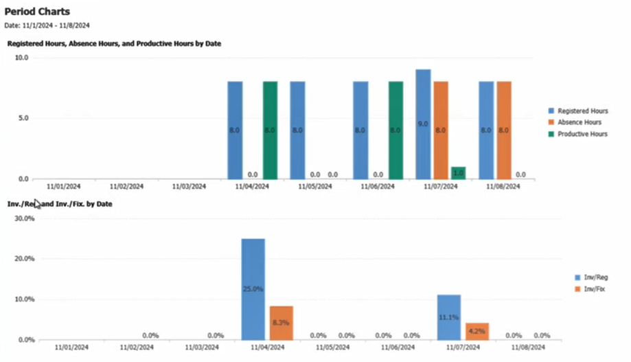 Utilization Degree Inv./Fix or Prod./Reg. This column displays the utilization degree, which is the result of dividing invoiceable (Inv./Reg.) or productive (Prod./Reg.) hours by the number of fixed hours for the employee.