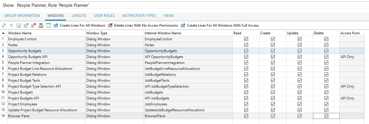 In addition the groups PP-Employee, PP-ProjectManager, and PP-ResourceManager are available for application to given users. These control relevant access rights in People Planner.