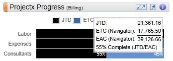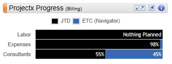 The JTD and ETC (Navigator) bars display what percent of the total planned bill amount is complete through today, and what percent of the planned bill amount remains for the total labor, expenses, and consultants.