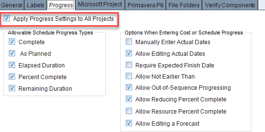 The settings on the Progress tab of the System Settings form allow you to configure settings for all projects (system-level), whereas the fields on the Progress tab of the Projects form allow you to configure settings on a project-by-project basis (project-level).