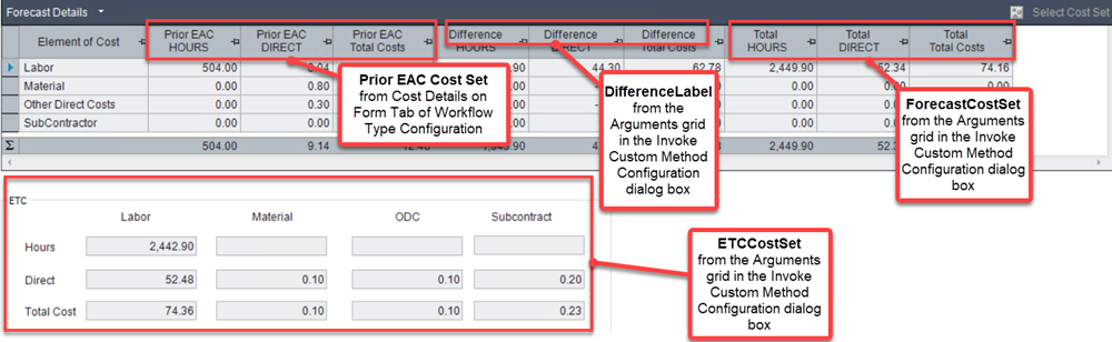 The lower part of the grid displays details of the ETC cost set (composed of Forecast classes), showing calculated results for each element of cost.