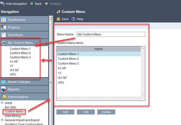 The menu item labels displayed on the Navigation menu depend on the names you define in the Menu Name field on the Custom Menu form and the Name field in the Custom Menu Item dialog box, respectively. Refer to the illustration below as an example.