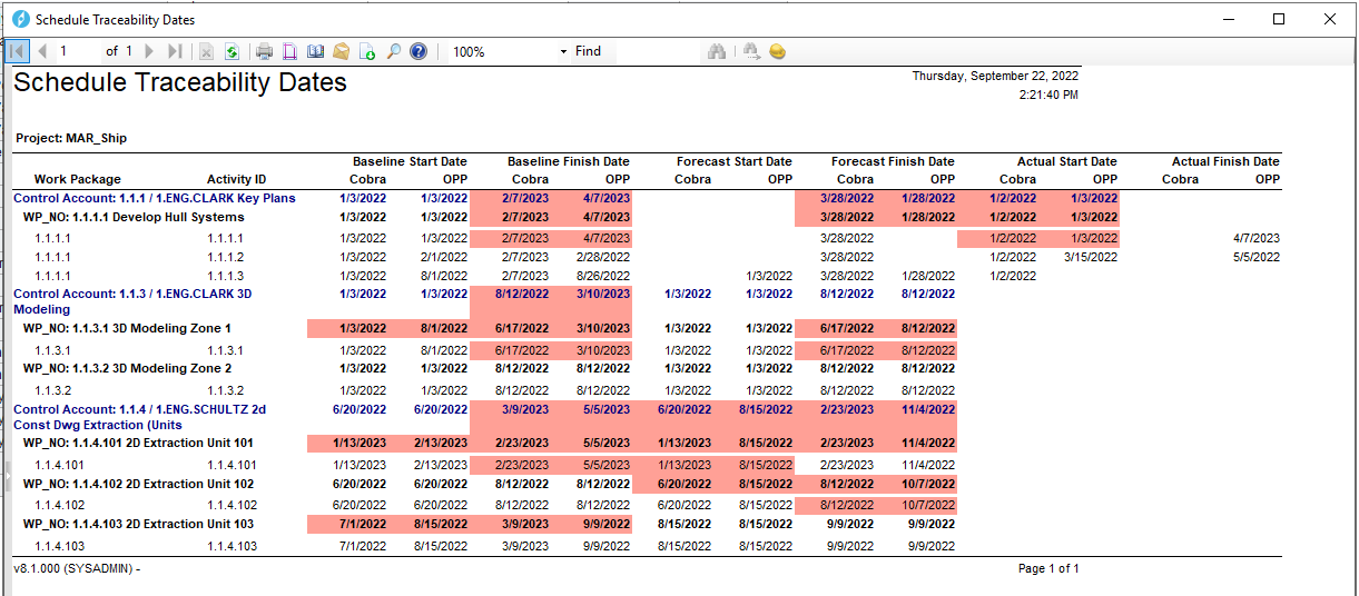 Use the Schedule Traceability Dates report to verify cost and schedule alignment. When you choose to sort or group the data by WP_NO, the report will display the activities linked to the work package and highlight the date in red if the work package date does not match the corresponding activity date.