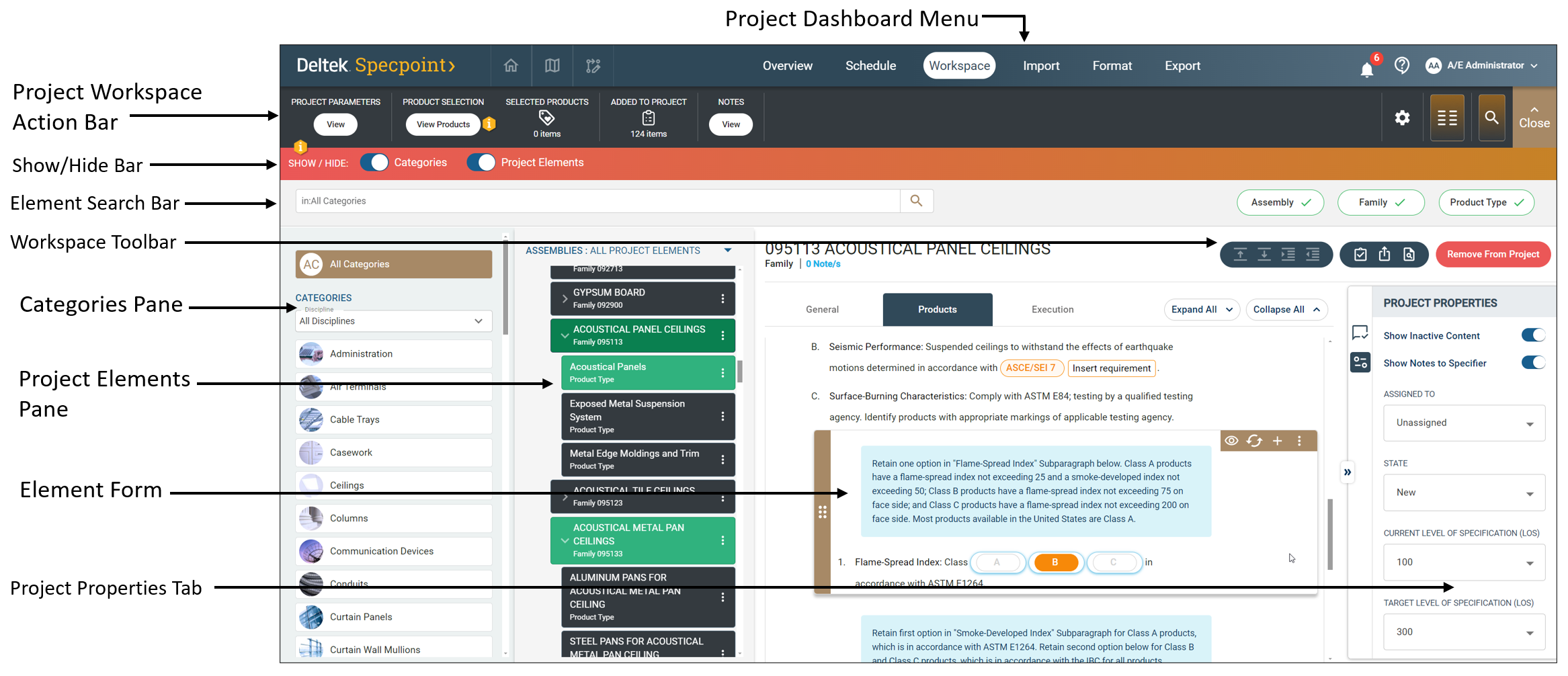 Use the workspace page, or simply the project workspace, to manage your project specifications and its included project elements and product listings.