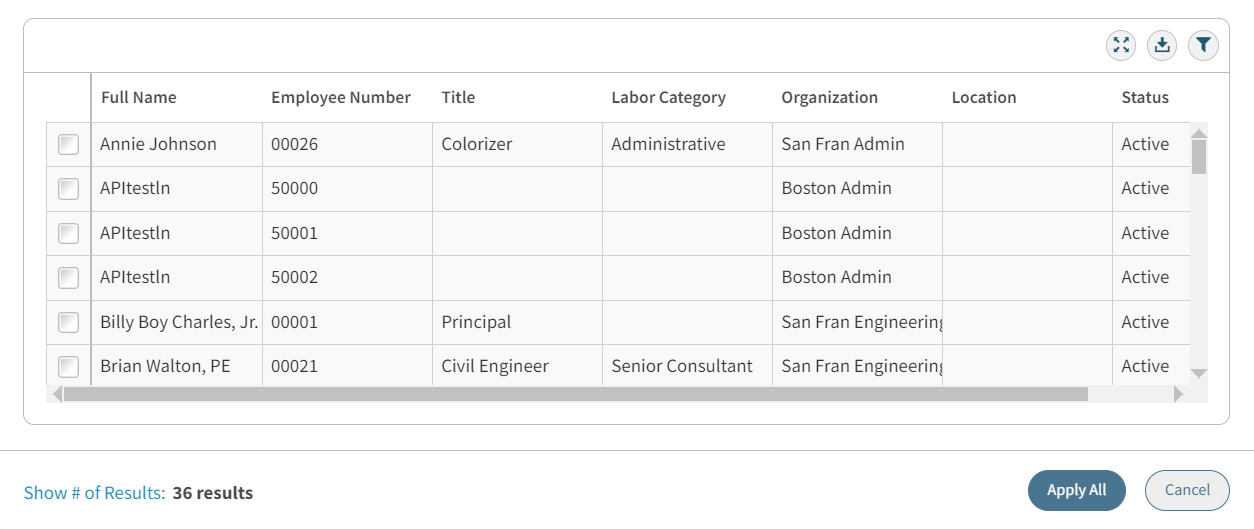 After building a search, you can view and select the checkbox for each search result that you want included in the search on the Search Results grid.