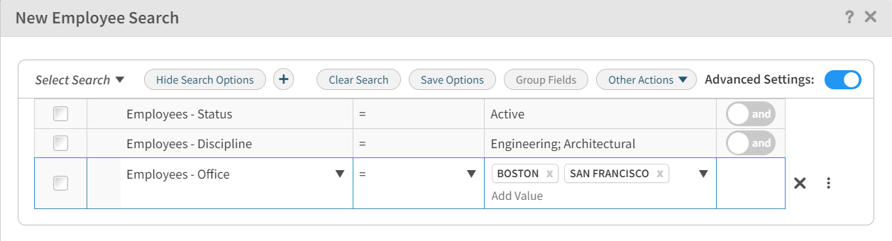 toggle to enter additional criteria that limits the data retrieved by the search. This type of search may include the use of comparative operators that locate multiple types of data.