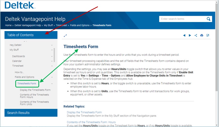 - The Table of Contents pane displays all the help topics for each application in Vantagepoint in the order that you see the applications in the Navigation menu in Vantagepoint.
