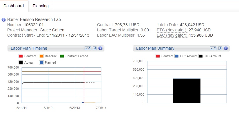 The Project Management dashparts display a summary of the selected project's information on the Dashboard. If your role established in allows you to access the Dashboard, you can see contract, labor, expense, and consultant dashparts even if you do not have access to their respective Planning grids.