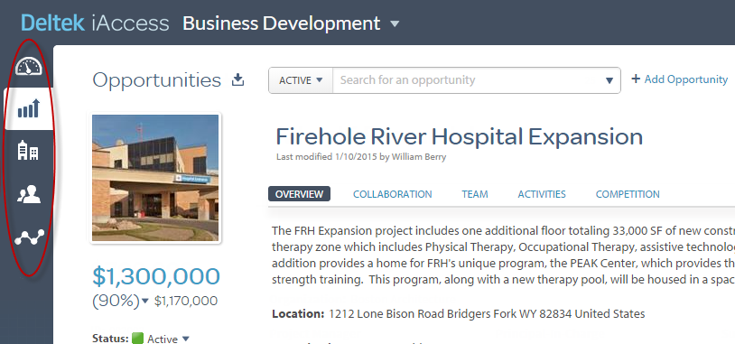 The title or name for the currently selected opportunity, company, or contact displays in the upper-left corner of the area, and key data display down the left edge to provide a summary view.