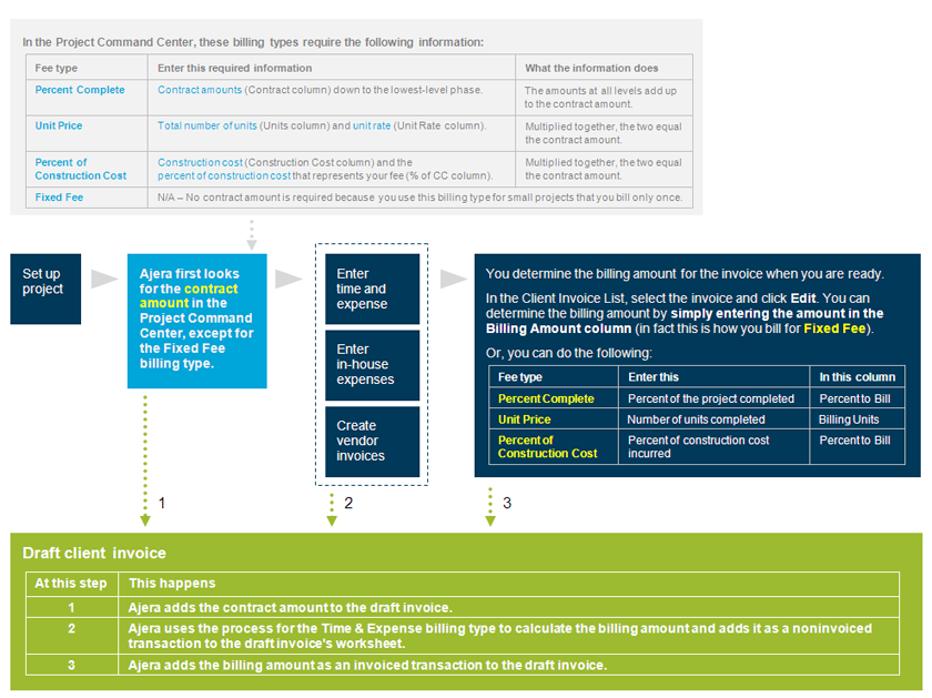In Ajera, the process of calculating billing amounts as invoiced transactions on a draft client invoice depends on the billing type.