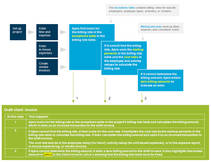 Here's how Ajera uses the billing rate table to calculate billing amounts for the Time & Expense billing type: