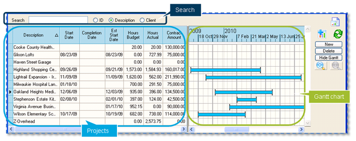 The project list is where you get a general picture of all your projects. In addition to displaying general information for each project, the project list can display a Gantt chart (timeline) that shows you the schedules of all the projects, relative to one another. To view this chart, click the Show Gantt button on the right of the window. The Gantt chart merely reflects the scheduling information on the Manage tab; it is not interactive and you cannot drag and change the start and end dates in the chart to change a project schedule.