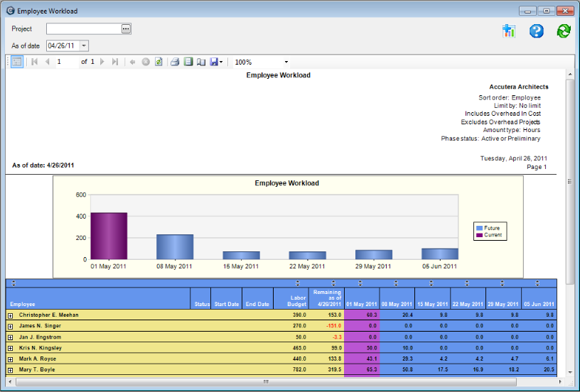 Use the Employee Workload report to determine your labor resource requirements. The report evaluates all employees assigned work at the project level and forecasts remaining amounts using a straight-line method for the phases. With this report, you can: