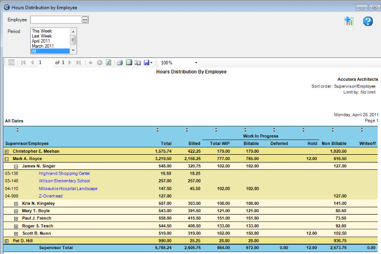You can summarize information by project manager or principal in charge, and drill down to project, phase, and employee timesheet detail information.