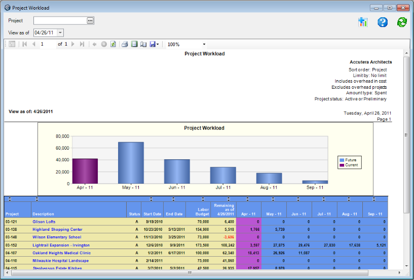 Use the graph view to see, at a glance, which projects need your attention. The comprehensive budget information on the report includes contract amount, amount spent, and amount remaining for labor, expenses, and consultants.