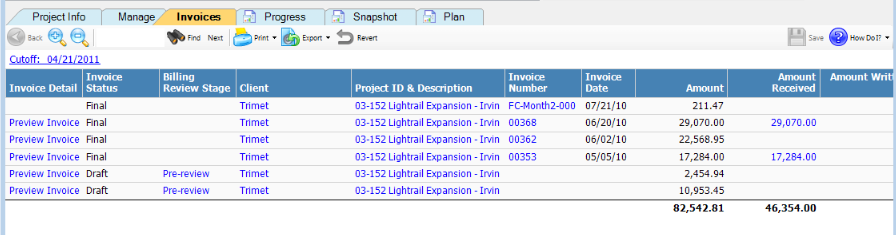 You can view the Pre-Billing Worksheet and the invoice from the Project Command Center by following the instructions in the next section, Review client invoices.