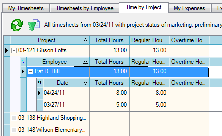 1. To see detailed time by employee for the project, click the next to the name of the project.