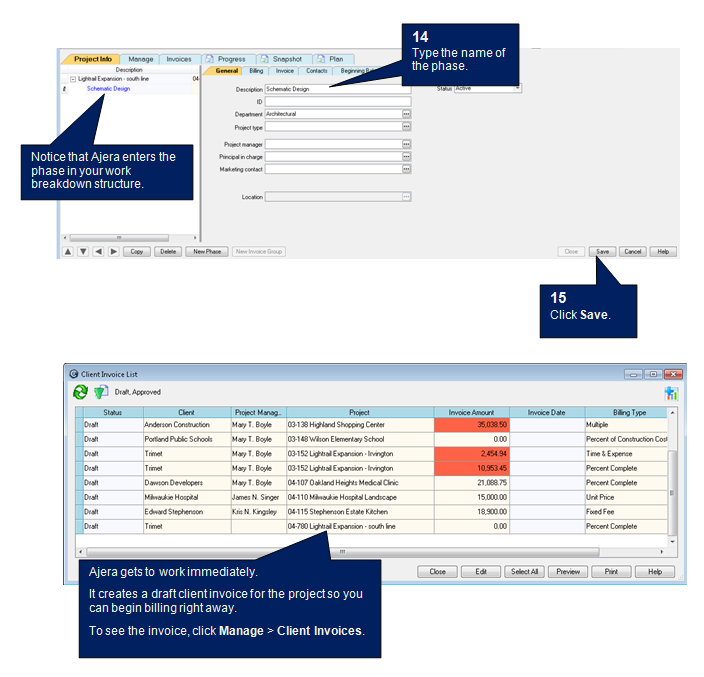 You can also track your business development and marketing effort by entering a potential project, and should you win the work, that information is ready for you to begin working on and billing the project. To learn about business development, be sure to see Marketing Specialist's Path through Ajera.