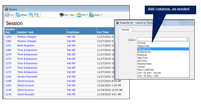 A session inquiry differs from a report in that you can more easily focus on the information you want. If you don't readily see what you need in the report, the inquiry provides a good way for you to research and investigate specific issues. For example, you can add columns for information you need to review.
