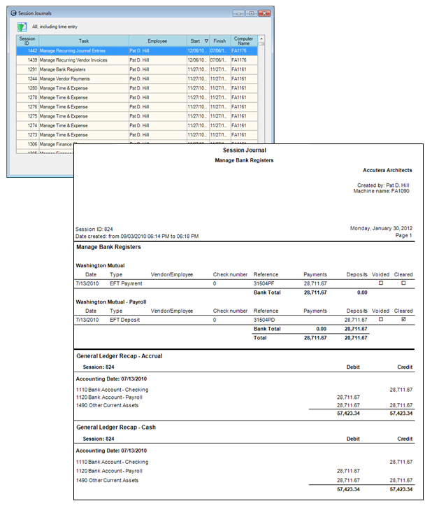 Session journal reports show entries created, changed, and deleted in a session. They also show a recap of accounts affected by the entries.