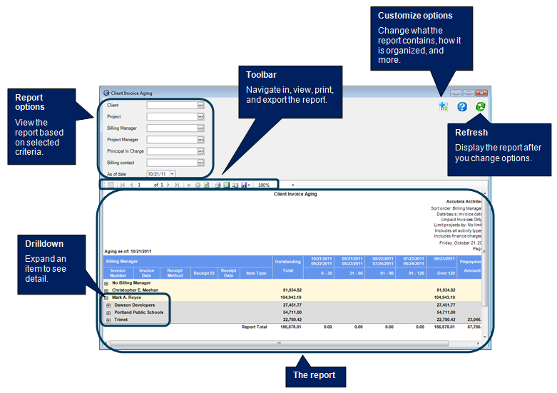 Ajera provides a set of reports designed for architectural and engineering firms. When viewing a report, it's easy to select custom options for it, navigate through it, and review information in it.