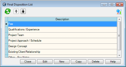 Set up a list of marketing final dispositions to reflect the typical reasons your firm wins, loses, or declines a project.