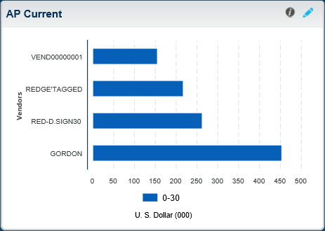 Hover over a bar to display a tooltip containing the vendor name and AP balance amount represented by that bar. Click a bar to open the View Voucher History Inquiry screen, where you can view the AP vouchers that have been outstanding for 0-30 days for a particular vendor.