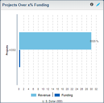 The Projects Over x% Funding dashpart is a horizontal bar chart that enables you to view the projects with revenue that is approaching a % threshold of the funded value of the contract. The data on this dashpart comes from Costpoint.