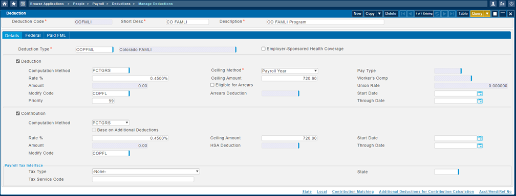 Configure the Colorado Paid Family and Medical Leave Insurance (FAMLI) on the Manage Deductions screen.