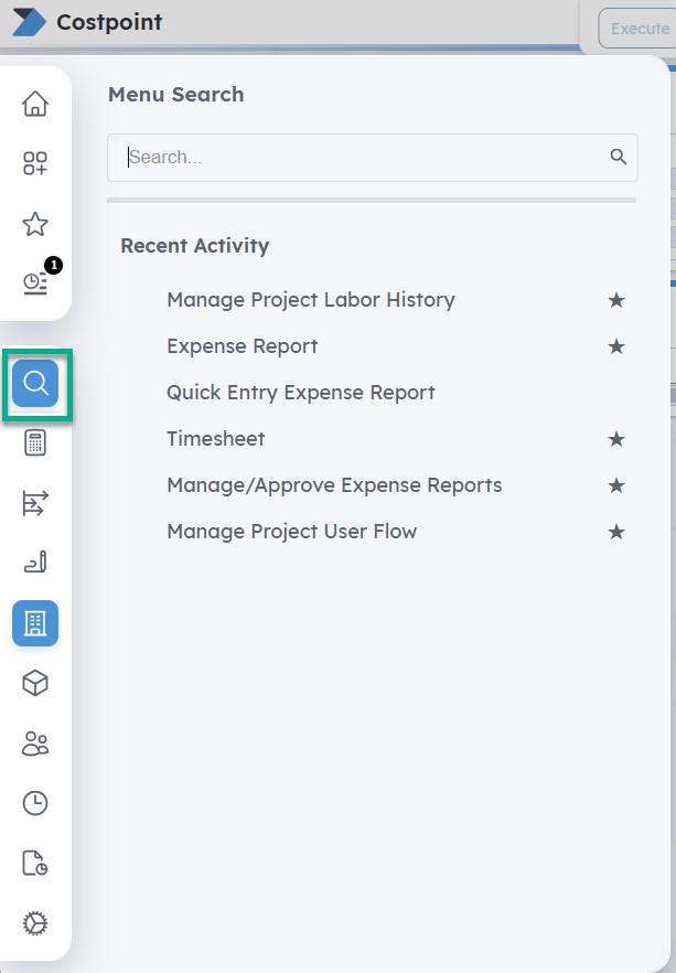 - Use Menu Search on the Navigation Menu. As you type in this field, Costpoint will suggest applications that match the text you enter. Select a result to open the application.