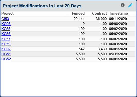 The Project Modifications dashpart is a numerical table that displays the total funded and contract values of top-level projects that had modification updates and/or additions (at any project level) in the past "x" days, together with the timestamp of the most recent modification. The data on this dashpart comes from Costpoint.