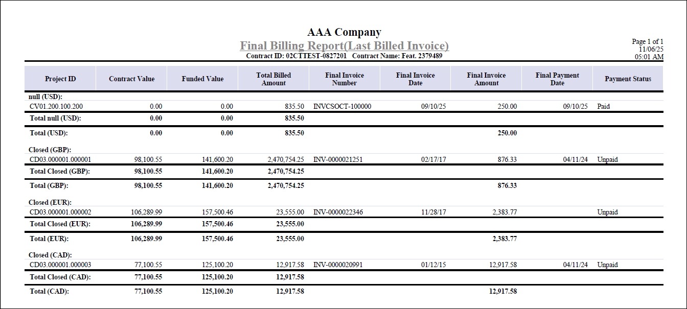 The Final Billing Report presents a comprehensive summary of final billing activity for projects linked to a contract, organized by status and currency.