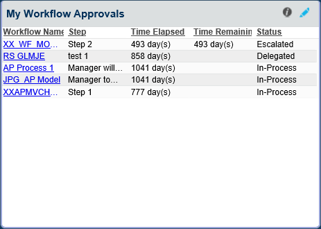 The table displays the workflow name containing the record that requires action. In addition, it displays the step name as well as the time elapsed and time remaining for the workflow approval task. The status of the approval task is also displayed, which can be In-Process, Escalated, or Delegated. You can limit the tasks you want to view based on the status, time elapsed, and/or time remaining using the Options dialog box, which you can access by clicking .