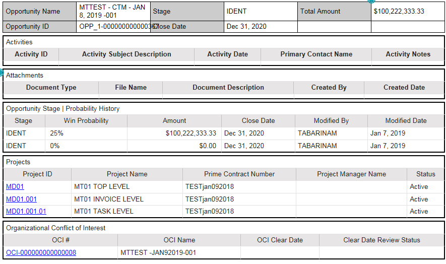 The Opportunity Drill Thru report displays opportunity details of a customer such as Opportunity Stage, Projects, and Organizational Conflict of Interest, if any.