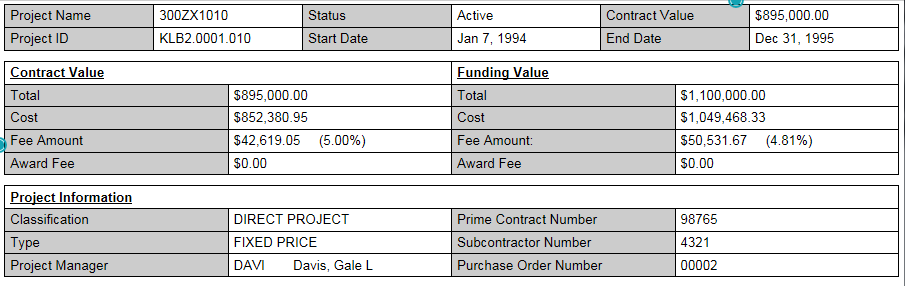 The Project Drill Thru report displays the project details of a customer such as contract and funding value.