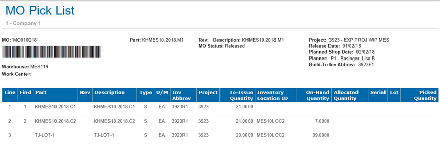 The following is an MO Pick List report printed with a barcode.