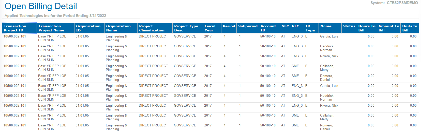 Sample Report View a sample of the Open Billing Detail report. Parent Topic: Open Billing Detail HomeReports & AnalyticsWelcome to Costpoint Business IntelligenceOverviewBillingBilling ReportsOpen Billing DetailSample Report