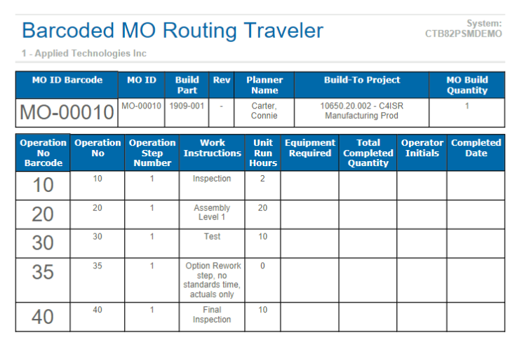 The Barcoded MO Routing Traveler report shows the MO barcode, MO ID and the sequence of steps associated with the MO.