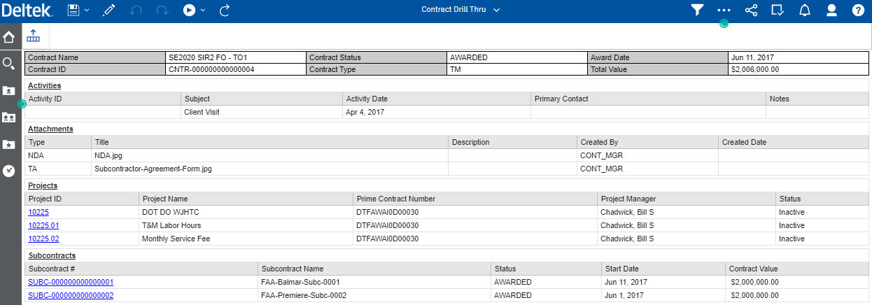 The Contract Drill Thru report displays the contract details of a customer such as activities, projects, and subcontracts.