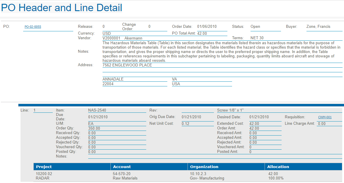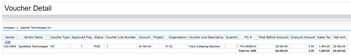 In the Posted PO Vouchers drill thru, click a voucher number to view the voucher details.