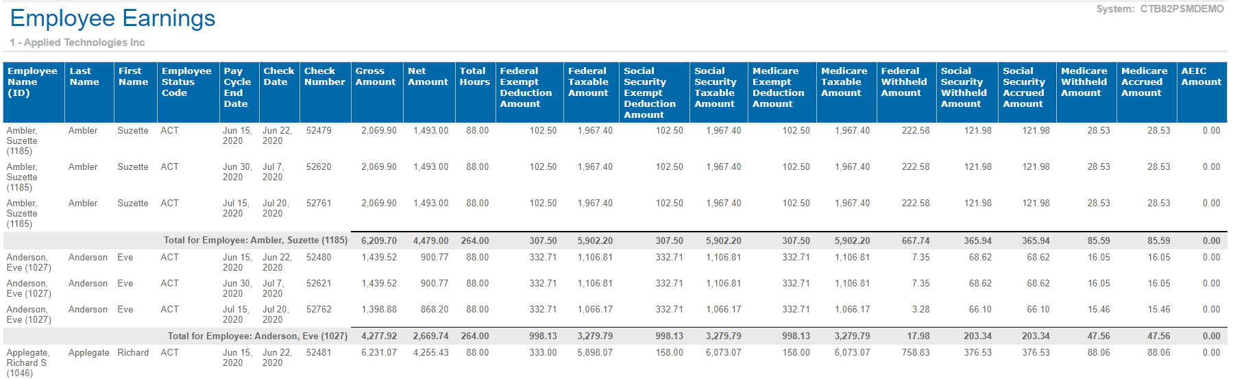 The report shows employee earnings for the selected pay periods.