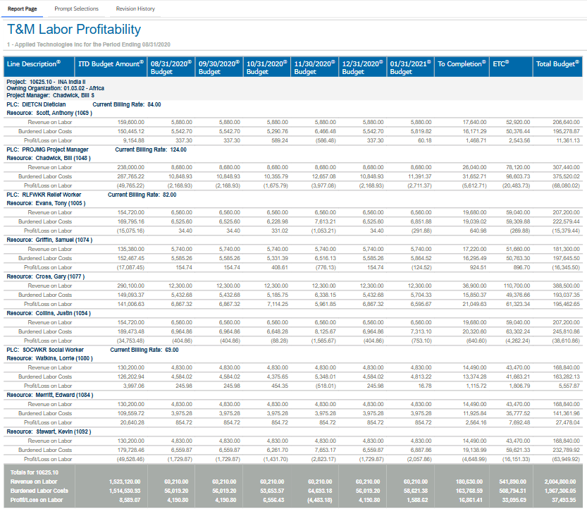 Sample Report This is a sample of the T&M Labor Profitability report. Parent Topic: T&M Labor Profitability Report HomeReports & AnalyticsWelcome to Costpoint Business IntelligenceOverviewPlanningPlanning ReportsT&M Labor Profitability ReportSample Report